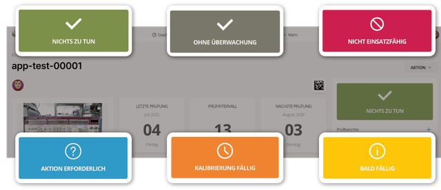 Der Status wird farblich, über ein Symbol und über Text angezeigt. Folgende Zustände kann der Prüfmittelstatus annehmen: