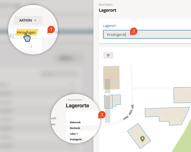Klicken Sie oben rechts auf den Button AKTION und wählen Sie Hinzufügen (1). Der Dialog zur Eingabe eines neuen Lagerortes erscheint. Geben Sie den Namen des neuen Lagerortes ein und klicken Sie dann rechts unten auf den Button HINZUFÜGEN. Der neue Lagerort wird gespeichert.