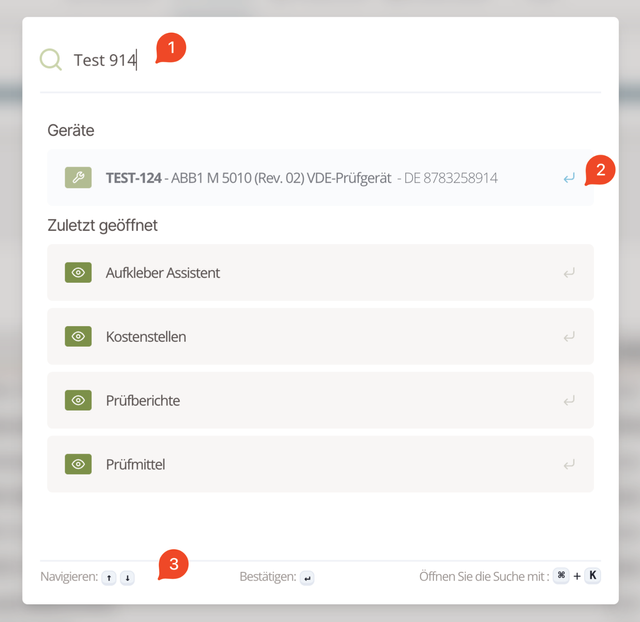 Abb.:2 Suchergebnis Sobald etwas eingegeben wird (1), zeigt die Suche potentielle Ergebnisse an (2). Die Ergebnisse der Suche werden je nach Art gegliedert. Die Ergebnisse können Sie mit den Pfeil‑Tasten (↑/↓) (3) navigiert werden.