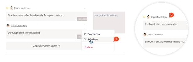 Open the comment menu via the three dots Three vertical dots. Choose Pin (1) to pin a comment.