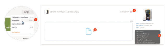 Open the action menu and choose Edit (1), or use a hotkey to enter edit mode. Upload any supporting documents (2) by dragging files into the drop zone or clicking the center.
