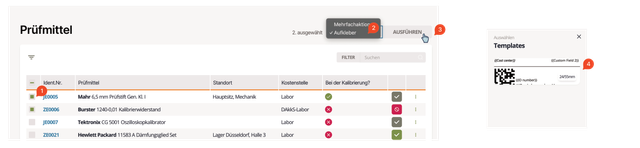 First select all devices in the list (1) that need a label. Next, click Bulk action (top right), then Label (2), and finally Execute (3). Choose the template you want to use (4). Memida generates a PDF with labels for the selected devices.